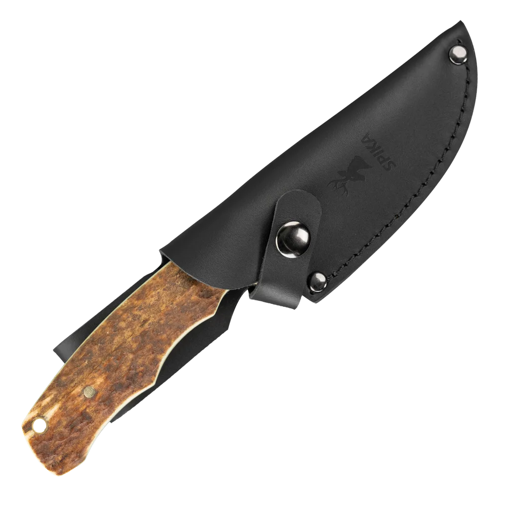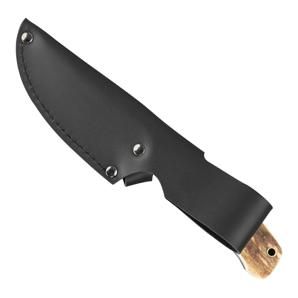 The Bushmaster Jeremiah hunting knife is built for the traditional bushman seeking a versatile hunting/skinning blade. It’s crafted from VG10 steel with a 60-61 HRC rating, so it keeps a hard edge in the field. The genuine deer antler handle blends durability with a natural grip. Complete with a heavy-duty leather sheath, the Jeremiah is a true bushman’s companion. Please note: Due to the natural deer antler handle, each knife will have unique variations in appearance.